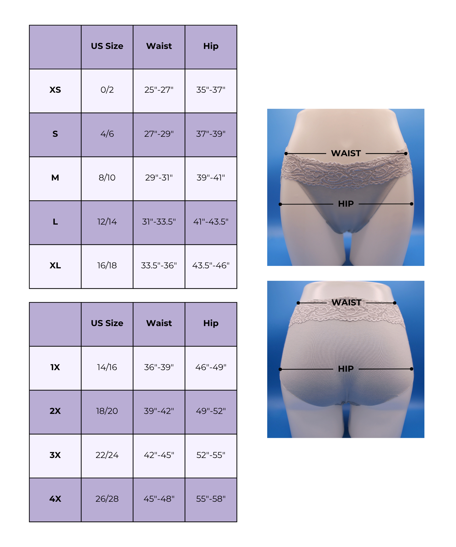 Our mesh style is high-waisted and a great choice for those who dislike the look or feel of lace. The lace style has a lower rise, sitting below the hip bones, which eliminates pressure around the navel area. We are currently developing even lower-rise options to accommodate a wider range of preferences.